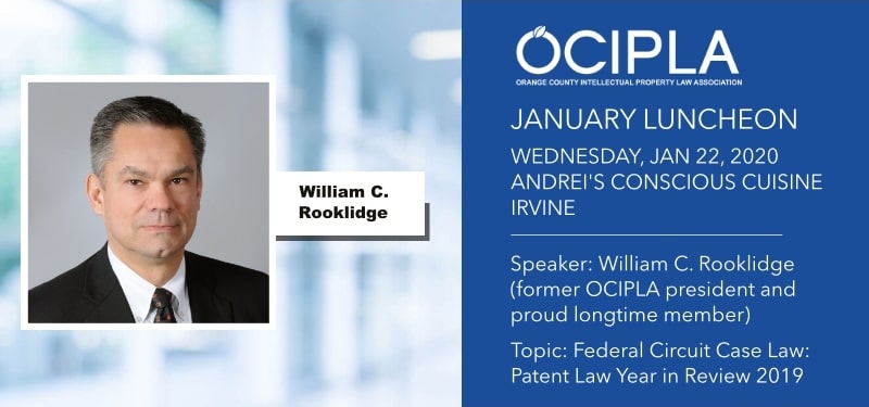 OCIPLA is pleased to announce the January 2020 luncheon! This month we are delighted to host Mr. William C. Rooklidge, past OCIPLA president and proud longtime member, who will be presenting “Federal Circuit Case Law: Patent Law Year in Review 2019.”